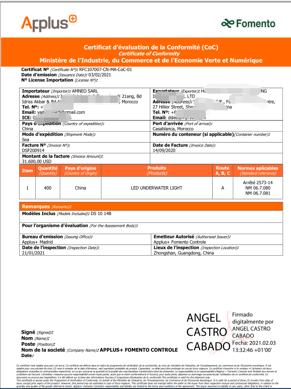1. 根據(jù)產(chǎn)品的類別,驗(yàn)證應(yīng)在對(duì)應(yīng)產(chǎn)品的出口國或目的國進(jìn)行。所有受管制的產(chǎn)品必須獲得COC證書,才能順利清關(guān),進(jìn)入摩洛哥市場。